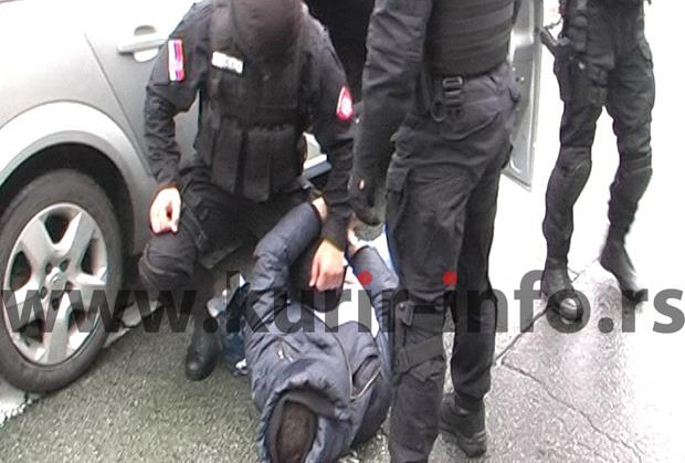 NOVI SAD - Dvojica osumnjičenih izvučena su iz svog automobila opel astra, danas oko 13 časova, u spektakularnoj akciji novosadske kriminalističke policije i specijalističkog odreda Žandarmerije, na uglu Bulevara oslobođenja i cara Lazara, ispred Merkatora u Novom Sadu.