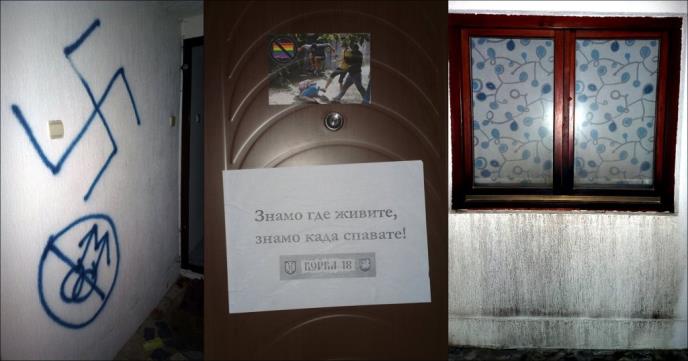 Vandali su na vratima ostavili sliku brutalnog nasilja prema pripadniku gej populacije i natpis "Znamo gde živite, znamo kada spavate", koji je potpisan sa "Borba 18".