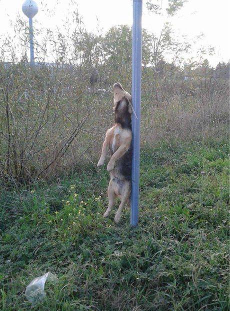 Na fotografiji se vidi pas mešanac koji je obešen o žicu koja je privezana za metalni stub.