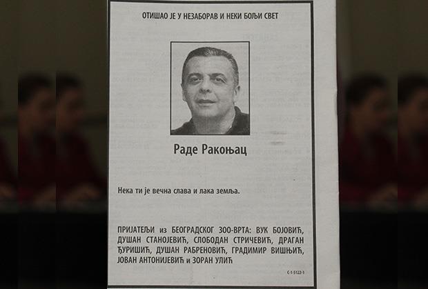 BEOGRAD - Radetu Rakonjcu (51) nekadašnjem telohranitelju i gardisti Željka Ražnatovića Arkana, i bliskom prijatelju Luke Bojovića (40), čitulju u novinama dao je Vuk Bojović, direktor zoološkog vrta sa svojim kolegama.