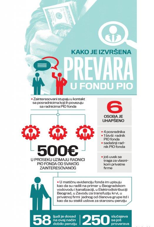 Za novčanu naknadu od 350 do 700 evra, osumnjičeni radnici Fonda PIO su u matičnu evidenciju Fonda upisivali fiktivni radni staž navodno ostvaren u JKP „Beogradski vodovod i kanalizacija“, u JP „Elektrodistribucija Beograd“, u Zavodu za transfuziju krvi ili u Stojkovićevoj privatnoj firmi „Vades“, iako ti građani nikad nisu bili zaposleni u preduzećima!