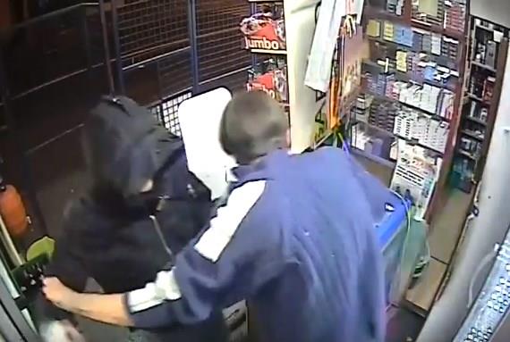 Može se videti sukob pljačkaša sa vlasnikom lokala. Na samom početku, pljaćkaš u crnoj jakni je nekoliko minuta šetao ispred radnje, dok nije prošao kroz rupu u ogradi iznad vrata prodavnice i ušao unutra. Tada je krenula borba.