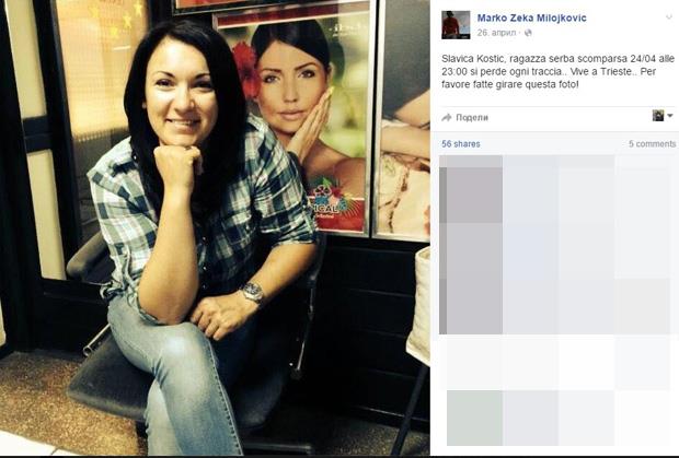 Podsetimo, italijanskoj policiji se prva obratila Nevena Kostić (17), koja je postala sumnjičava kada joj se majka nije javila iz Italije. Porodica se poslednji put čula sa Slavicom 24. aprila uveče, kada je stigla u Trst, gde je godinama brinula o starijem bračnom paru.