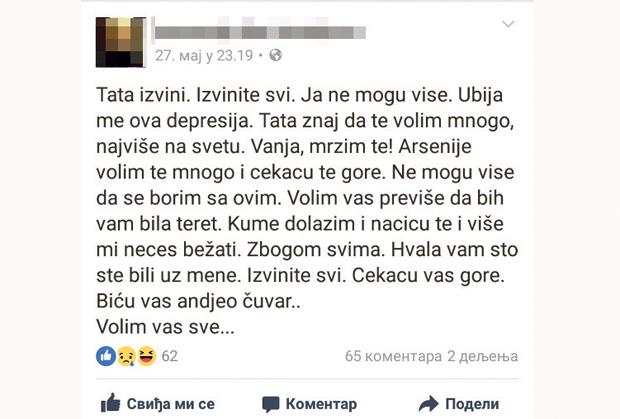 - Tata, izvini. Izvinite svi. Ja ne mogu više. Ubija me ova depresija. Tata, znaj da te volim mnogo, najviše na svetu. Vanja, mrzim te. Arsenije, volim te mnogo i čekaću te gore. Ne mogu više da se borim s ovim. Volim vas previše da bih vam bila teret. Kume, dolazim i naći ću te i više mi nećeš bežati. Zbogom svima. Hvala vam što ste bili uz mene. Izvinite svi. Čekaću vas gore. Biću vaš anđeo čuvar... Volim vas sve... - napisala je devetnaestogodišnjakinja na svom profilu.