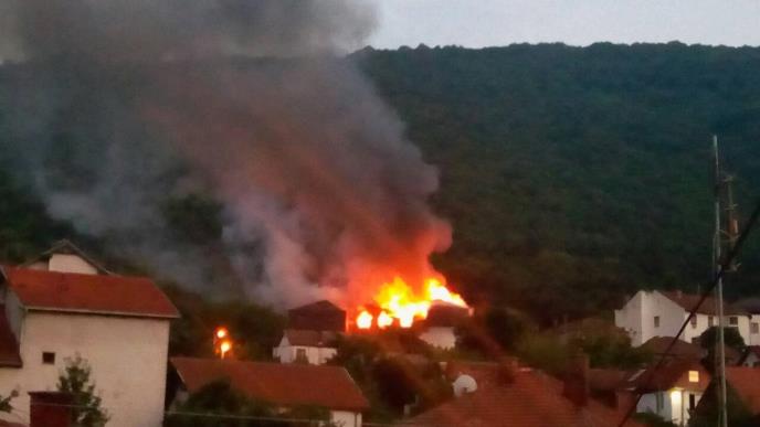 "Upravo se obrušio deo krova, ja strahujem da požar ne prođe sa druge strane i da vatra ne zapali delove kuća. Zasad, prema našim informacijama, nema povređenih, ali vatra nije pod kontrolom", rekao je Jovanović