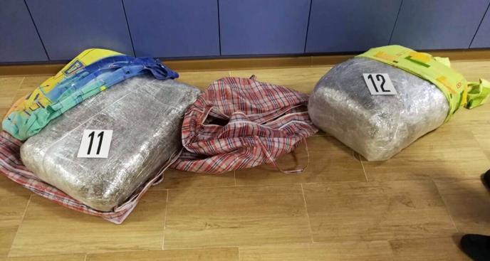 Policija je marihuanu ukupne težine 14,82 kilograma pronašla u dve najlon kese, sa navučenim jastučnicama, u torbama koje su osumnjičeni nosili, navodi se u saopštenju MUP.