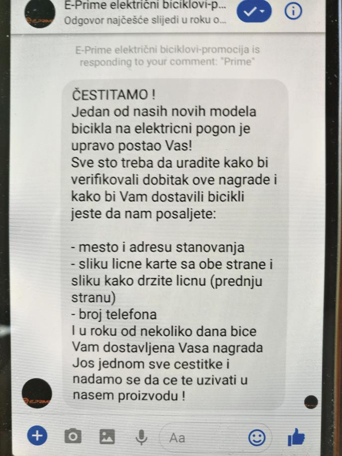 - Pre nekoliko meseci pojavila se lažna stranica naše firme, sa koje su prevaranti obaveštavali korisnike da su kao nagradu dobili bicikl, kao i da će im biti isporučen kada pošalju svoju fotografiju i sliku lične karte. Da je u pitanju prevara, otkrili smo kada su ljudi počeli da nas zovu i traže svoje nagrade, a u međuvremenu, po identičnom modelu, otvorene su lažne stranice još nekih firmi - kazao je za Kurir Milan Manojlović iz firme "E prime", napominjući da je bilo i onih građana koji su pre slanja dokumenata kontaktirali s firmom i saznali da je u pitanju prevara.