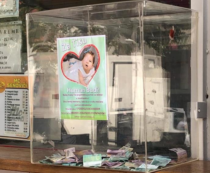 Oni su u subotu, ispred jedne hamburgerije kod gradske pijace, ukrali kutiju sa novcem za lečenje teško bolesne četrnaestomesečne Kikinđane Tise Sredojev.