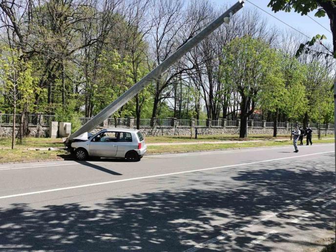 Od siline udarca automobil je iščupao banderu, koja se nakrivila preko kolovoza. Nije se srušila samo zato što je drže kablovi.