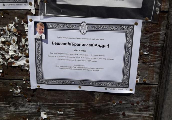 Na groblju kod Petrove crkve u novopazarskom naselju Dževski put sahranjen je četvorogodišnji dečačić Andrej B. koji je preminuo u nedelju popodne u Opštoj bolnici u Novom Pazaru posle saobraćajne nesreće koja se tog dana, nešto ranije, dogodila u selu Kovačevo, na putu od Novog Pazara prema Goliji.