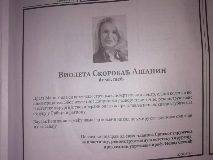 - Draga maco, bila si vrhunski stručnjak, požrtvovani lekar, odani kolega i veliki prijatelj. Zbog izuzetnog doprinosa razvoju plastične, rekonstuktivne i estetske hirurgije tvoj prerani odlazak nenadoknadljiv gubitak za struku u Srbiji i regionu. Zauvek ćeš živeti među nama jer voljeni nikada ne umiru sve dok žive oni koji ih se sećaju.