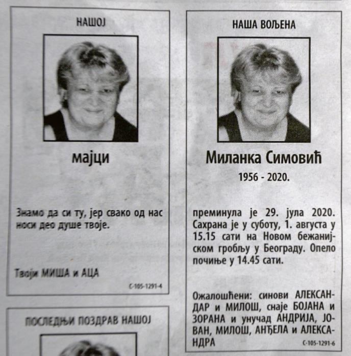 "Milanka je iznenada dobila povišenu temperaturu, a posle testiranja je potvrđeno da je zaražena koronavirusom i smeštena je na lečenje u Zemunsku bolnicu. Stanje joj se naglo pogoršalo i odmah je priključena na respirator. Preminula je 29. jula, posle svega dva dana na respiratoru! Cela porodica je bila u šoku", kaže anonimni izvor i dodaje: