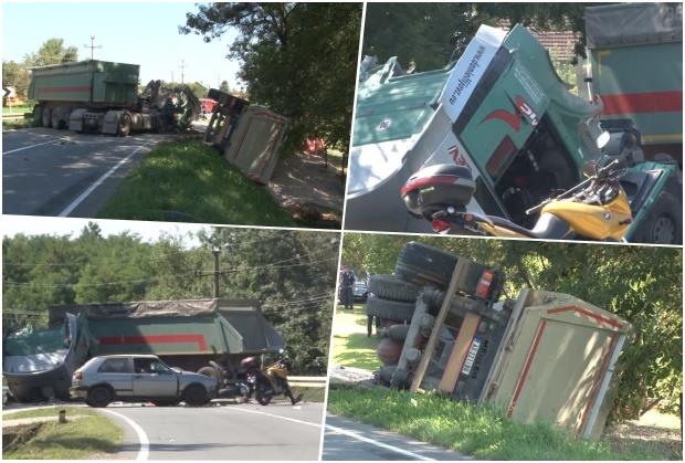 PRVI SNIMAK S MESTA NESREĆE, JEZIVE SLIKE S PUTA KOD OBRENOVCA Kamion prevrnut, auto zgužvan, na licu mesta i vatrogasci