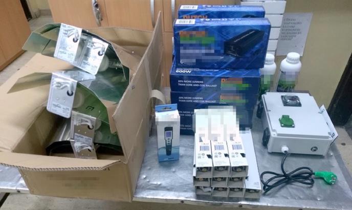 pretvarača električne energije poznatih robnih marki. Među opremom su pronađeni i tajmer sklopka, digitalni merač vlažnosti vazduha, kao i nekoliko litara za prihranu biljaka.