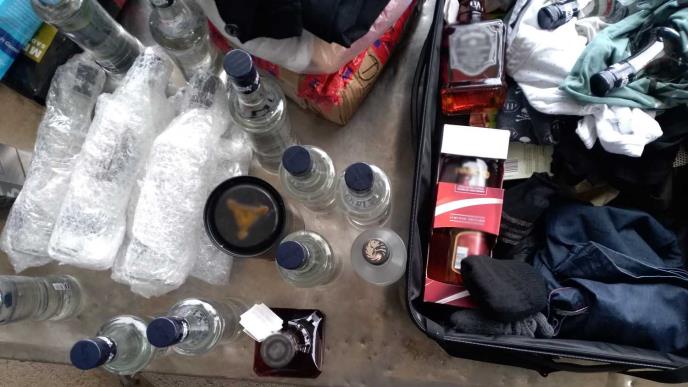 Oni su carinicima rekli da sa sobom nose samo lični prtljag, ali je tokom detaljne kontrole vozila najpre otkriveno da je prostor za rezervni točak ispod tapacirunga prtljažnika ispunjen flašama alkoholnih pića.