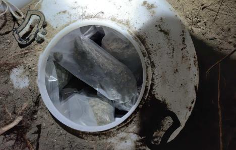 Pretresom stana i drugih prostorija, policija je, u vinogradu blizu kuće osumnjičenog, pronašla dva zakopana plastična bureta u kojima je bilo oko 15,5 kilograma marihuane zapakovane u 11 najlonskih paketa i pet papirnih vreća.