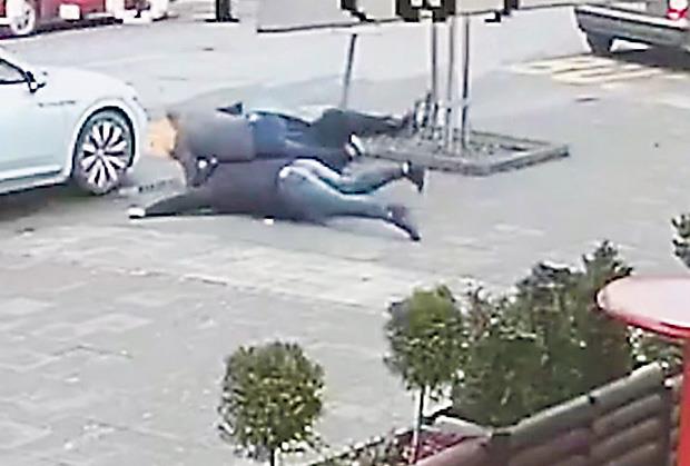 U jednom trenutku napadnuti čovek pokušao je da ustane, ali su ga napadači udarili i maltene zakucali za beton. Nekoliko sekundi kasnije pojavio se mladić koji ih je oborio i razdvojio.