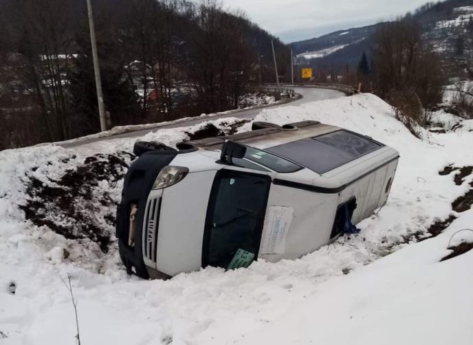 UŽICE - Na magistralnom putu od Užica ka Bajinoj Bašti u mestu Volujac pod još neutvrđenim okolnostima prevrnuo se mini bus užičkih registarskih oznaka.
