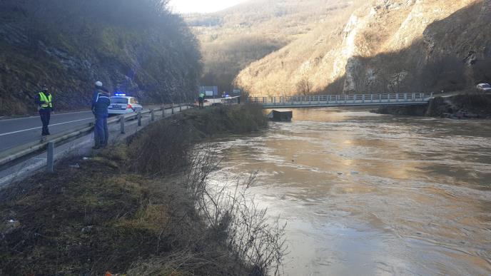 Prijepolje - Pripadnici policije obezbeđuju deonicu puta kod Bistrice i čeka se dolazak ronilačkih ekipa koje će započeti izvlačenje automobila koji je završio u reci Lim.
