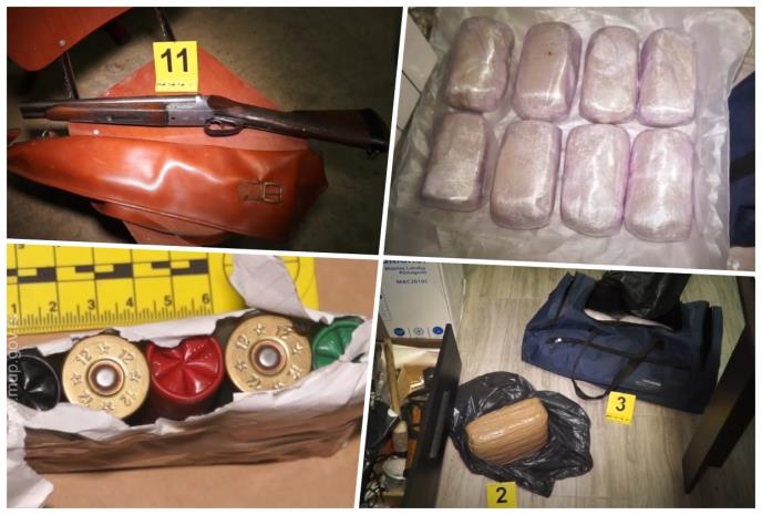 Policija je ličnim pregledom kod osumnjičenog pronašla manju količinu kokaina i marihuane. Pretresom kuće i pomoćnih prostorija u Dobanovcima u kojoj neprijavljeno boravi pronađeno je oko 2,5 kilograma marihuane, oko kilogram heroina, oko 150 grama kokaina, oko 100 grama amfetamina, oko 100 grama hašiša, oko osam kilograma baze za uvećanje mase, elektronska vagica, aparat za vakumiranje i puška-kratež sa sedam patrona.