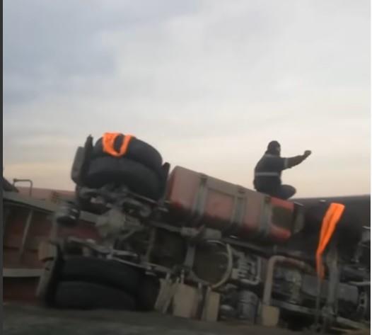 BEOGRAD - Na delu auto-puta kod Novog Žednika ofroman šleper prevrnuo se na stranu a iz jarka mu vire samo točkovi.