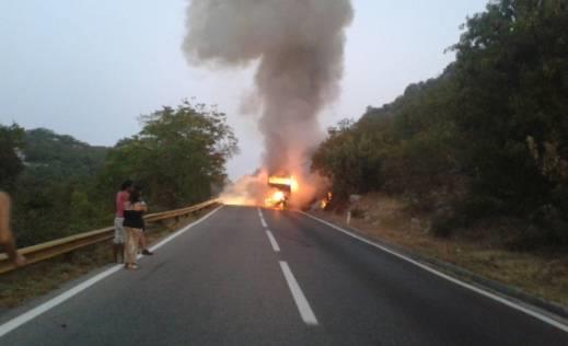 Autobus kragujevačkog preduzeća izgoreo je juče ujutru u mestu Gospoština, na putu Podgorica-Cetinje, ali tom prilikom nije bilo povređenih putnika.