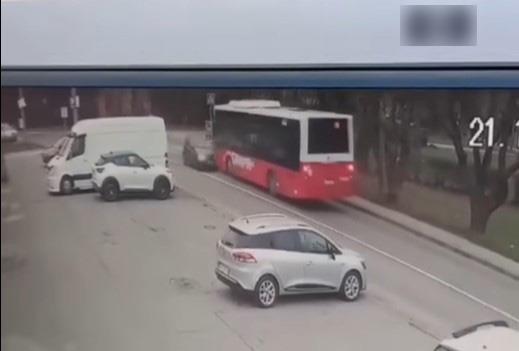 Automobil posle skretanja udara u autobus koji nije uspeo odmah da se zaustavi. Naime, vozač automobila očigledno nije zakočio koliko je trebalo i nakon što je “isekao” krivinu naleteo je pravo na autobus.