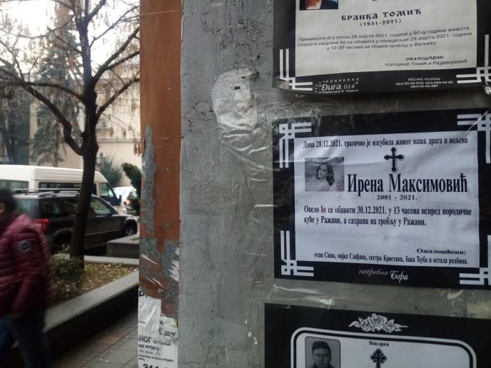 Troje mladih Valjevaca nastradalo je na putu Šabac-Valjevo, kada je "pežo 307" kojeg je vozio Nemanja A (20), iz još uvek neutvrđenih razloga, prešao u drugu kolovoznu traku i direktno udario u kamion koji je dolazio iz suprotnog smera. Pored vozača, na licu mesta život je izgubila Irena M. (20) na mestu suvozača i Ognjen P. (21), koji je sedeo pozadi, kao i pas kojeg je Irena držala u krilu.
