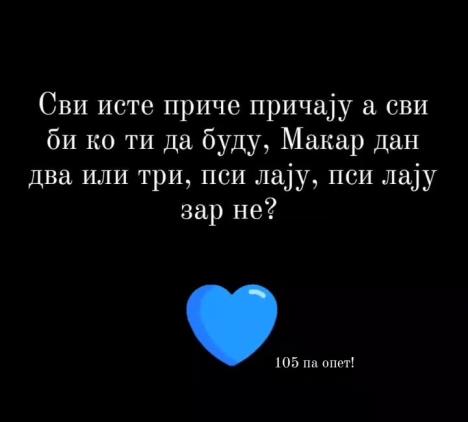 - Svi iste priče pričaju, a svi bi ko ti da budu. Makar dan, dva ili tri, psi laju, psi laju, zar ne? 105, pa opet! - glasi jedna od objava.
