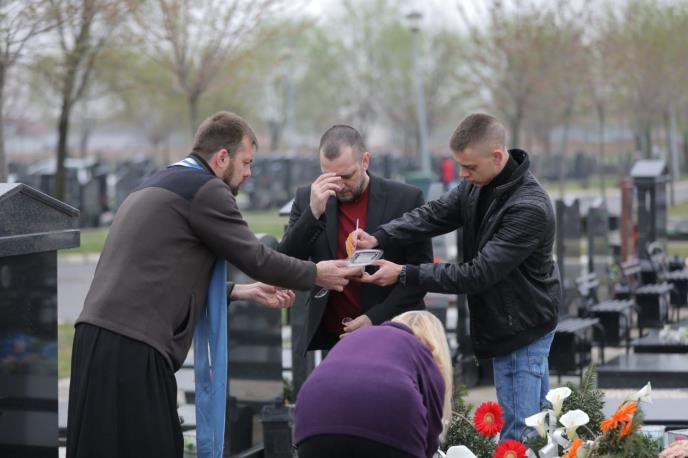 Čim su stigli, vidno potreseni, zapalili su sveće, a zatim je sveštenik počeo sa držanjem pomena, a nakon što je završen, Marjanovići i kuma Vera seli su u svoj automobil i otišli.