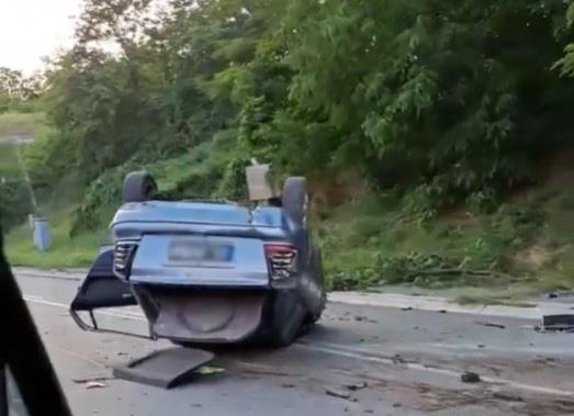 Automobil se prevrnuo na krov, a oko njega su rasuti delovi svud po putu.