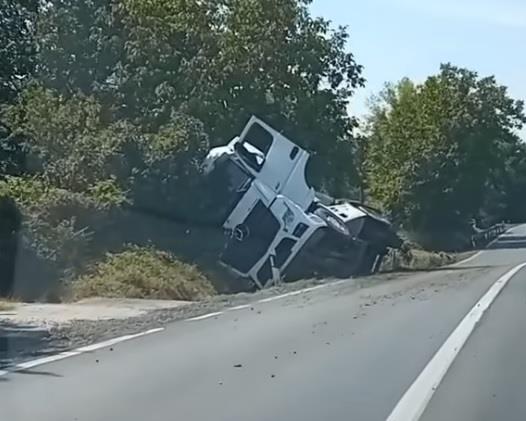 Kako se može videti, kamion je bio pod teretom, jer je iz prikolice koju je vukao ispao pesak ili šljunak koji je prevozio.