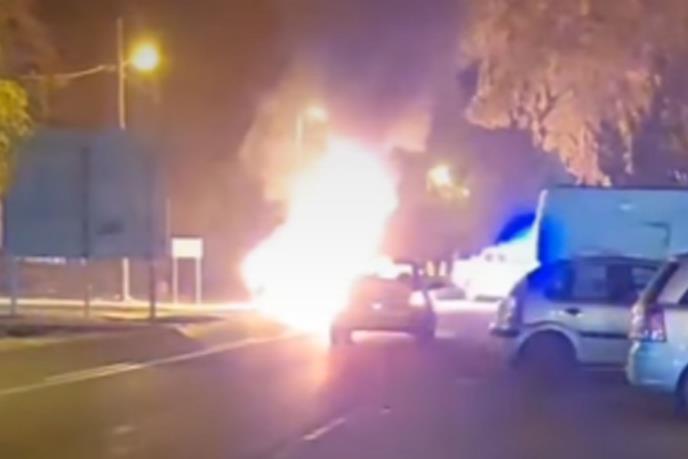 DRAMA U BANATSKOM KARLOVCU: Automobil gori nasred ulice, odjekuju eksplozije, niko ne sme da priđe (VIDEO)