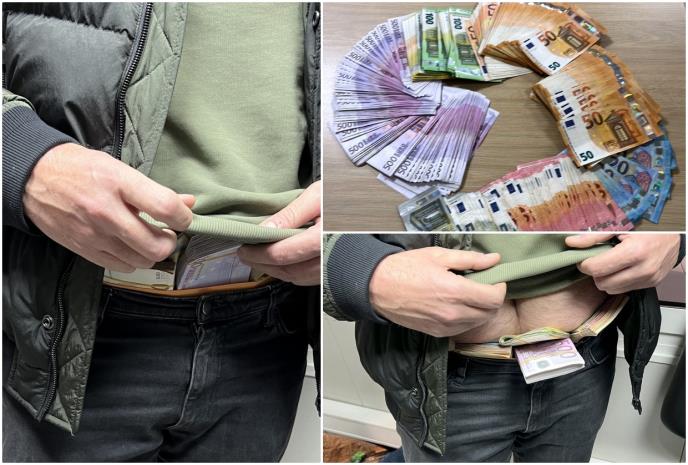 Međutim, ono što je prećutao otkriveno je tokom ličnog pretresa, kada je ispod garderobe, oko struka putnika pronađen platneni pojas napunjen svežnjevima gotovog novca.