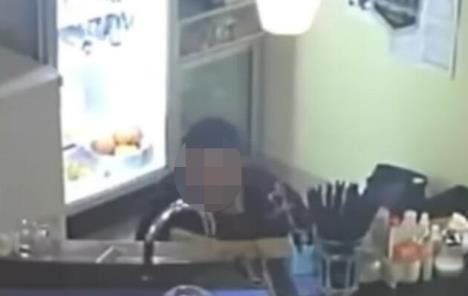 Na snimku se vidi kako muškarac dolazi iza šanka, saginje se krijući se, onda otvara jedna po jedna vratanca, dok nije pronašao šta je tražio.