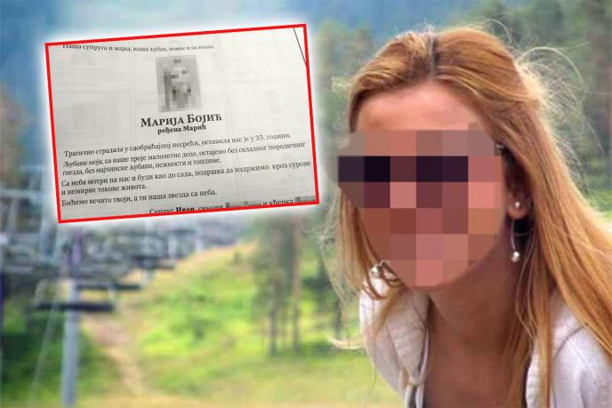 - Naša supruga i majka, naša ljubav, ponos i oslonac tragično je stradala u saobraćajnoj nesreći, ostavila nas u 35. godini. Ljubavi moja, sa naše troje maloletne dece, ostajemo bez skladnog porodičnog gnezda, bez majčinske ljubavi, nežnosti i toplote. Sa neba motri na nas i budi kao i do sada, podrška da izdržimo kroz surove i nemirne tokove života. Bićemo večito tvoji, a ti naša zvezda sa nema - stoji u čitulji koji je potpisao neutešni Marijin suprug sa troje dece.