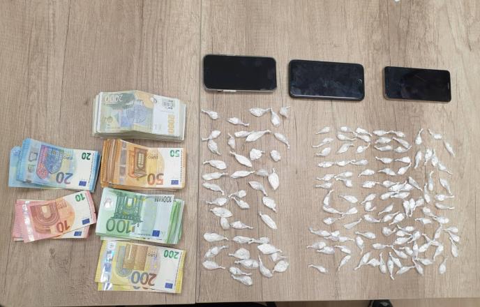 Prilikom pretresa kuće osumnjičenog na području Inđije, policija je ispod stepeništa, u obući, pronašla 141 paketić sa ukupno 100 grama praškaste materije za koju se sumnja da je kokain, 4250 evra i 294.000 dinara za koje se sumnja da potiču od prodaje opojne droge.