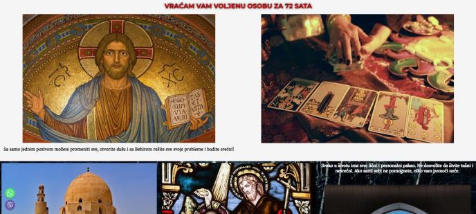 - Otkljanjamo želju za alkoholom, drogom i kockom. Kakav god da je razlog rastanka sa izgubljenom ljubavlju, u roku od 3 dana će vam se vratiti. Dovoljno je da mi pošaljete fotografiju voljene osobe - piše na sajtu, gde dodaju da "Behira moćnim ritualima koje su još njeni preci koristili, oslobađa zlih čini, mračnih i negativnih sila i čisti Vaše telo i duh negativne energije i pomažem Vam da vratite sreću u Vaš život!"