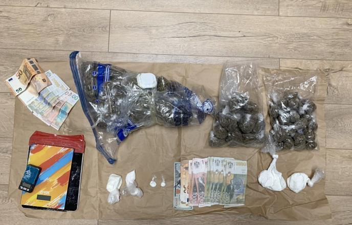 Pregledom osumnjičenog i pretresom stana, u kome neprijavljeno boravi, policija je pronašla više od kilogram marihuane, 272 grama amfetamina, dve digitalne vage i novac, u domaćoj i stranoj valuti, za koji se sumnja da potiče od prodaje narkotika.