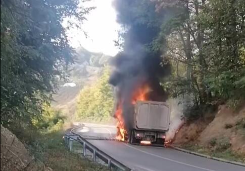 "Teretnjak stoji uz samu ivicu puta, sav je izgoreo, još uvek se sve oko njega puši. Na prikolici je prevozio građevinsku mašinu", kaže jedan od očevidaca.