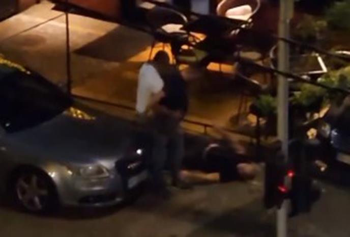 Tada prilazi drugi muškarac u beloj majici, ali mladić koji je zadao udarac ne dozvoljava mu da priđe čoveku na zemlji i praktično ga štiti od batina, iako ga je prethodno patosirao.