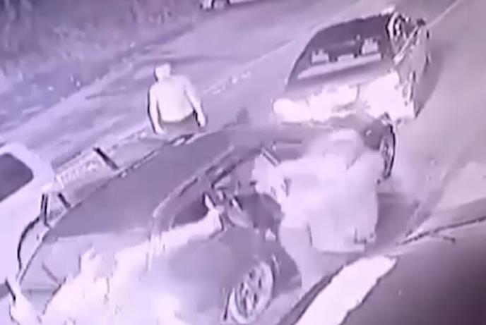 Kako se vidi na snimku sa nadzorne kamere, sve je počelo kada je jedan automobil presekao put drugom kako bi ga zaustavio. Tada su iz prvog vozila izašla trojica muškaraca sa palicama u rukama i krenula ka drugom autu.