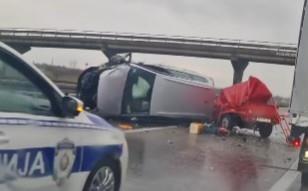 JEZIVA NESREĆA NA AUTO-PUTU KOD VELIKE PLANE: Kombi prevrnut nasred puta, KRHOTINE RASUTE SVUDA (VIDEO)