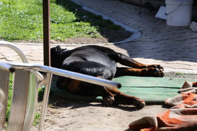Sijalica na tremu i dalje gori, veš, sada već suv i dalje visi na štriku, a porodični pas nepomično leži u travi.