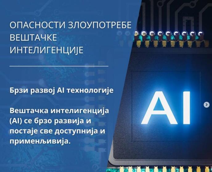 Kako su naveli iz MUP, veštačka inteligencija (AI) se brzo razvija i postaje sve dostupnija i primenljivija. AI može biti iskorišćena za kriminalne aktivnosti, kao što su: kreiranje lažnog sadržaja za prevare, korišćenje za ucene, pravljenje ilegalnog pornografskog materijala...