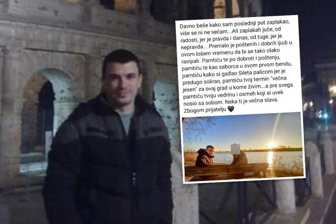 - Davno beše kako sam poslednji put zaplakao, više se ni ne sećam. Ali zaplakah juče od radosti, jer je pravda, i danas od tuge jer je nepravda. Premalo je poštenih i dobrih ljudi u ovom lošem vremenu da bi se tako olako rasipali. Pamtiću te po dobroti i poštenju, pamtiću te kao saborca u svom prvom bendu. Pamtiću kako si gađao Sileta palicom jer je predugo solirao, pamtiću termin "večna jesen" za ovaj grad u kome živim. A pre svega pamtiću tvoju vedrinu i osmeh koji su uvek nosio sa sobom. Neka ti je večna slava. Zbogom prijatelju - objavio je Srđanov drug na Fejsbuku uz njihovu zajedničku fotografiju na kojoj nasmejani poziraju pored reke.