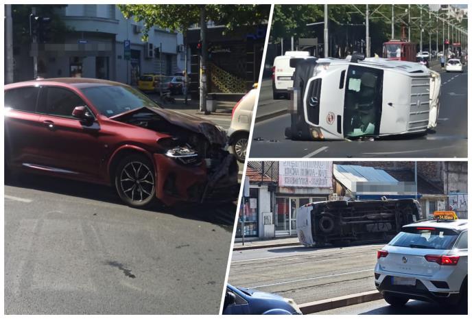 ŽESTOK SUDAR NA BULEVARU KRALJA ALEKSANDRA: Auto uništen, kombi se prevrnuo! Saobraćaj u zastoju kod Đerma (FOTO/VIDEO)