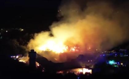 Iz pogona koji gori povremeno se razležu eksplozije, a upućeni kažu da to pucaju boce i rezervoari za gorivo.