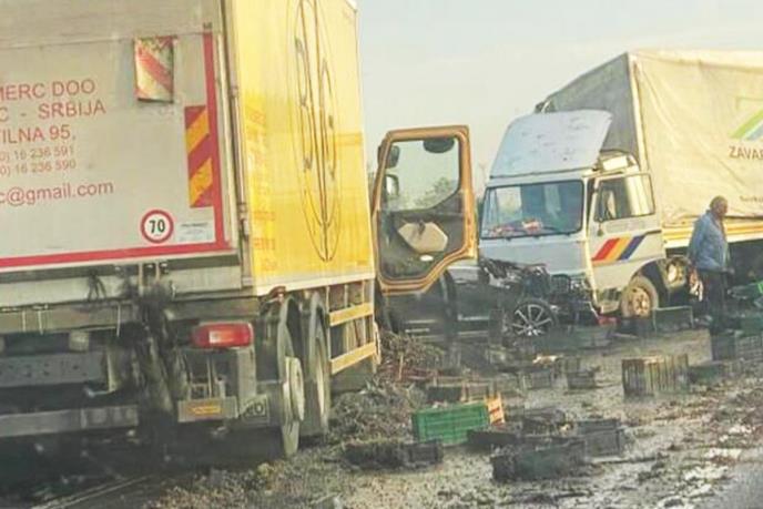 Kako se može videti na fotografiji koja je objavljena na Instagram stranici 192_rs, automobil je smrskan između dva kamiona, a po putu je rasut i teret iz kamiona.