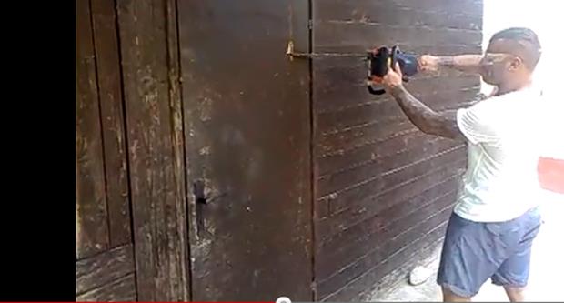 NOVI SAD - Kurir je došao u posed snimka na kome se vidi kako Darijan Musić, osumnjićeni za ubistvo novosadske manekenke Vladislave Červenko, motornom testerom pokušava da na silu otvori vrata od dvorišne kuće. Naime kako stoji u potpisu videa, Musić u stvari nema kljućeve pa se dosetio da bi vrata mogao da otvori i motornom testerom. Dok ga sve vreme s odobravanjem snima njegovo društvo, on im sa zadovoljstvom pozira...